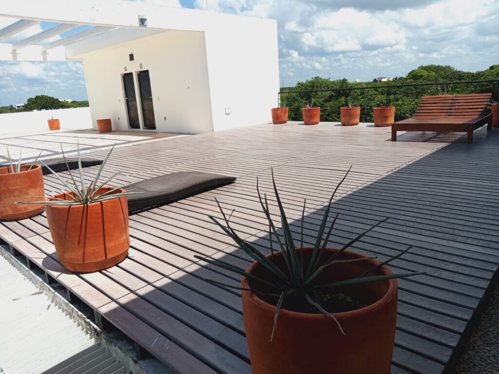 Departamento completamente amueblado en tercer piso ubicado en zona Ejido Sur, calle 7, Casa Tzonot. Departamento de 2 recámaras y 2 baños. Rooftop con solarium y alberca. Terraza privada com mobiliario exterior. Centro de lavado, closets, 3 aires acondicionados. Incluye mantenimiento. Disponibilidad inmediata. Edificio con alberca y estacionamiento.